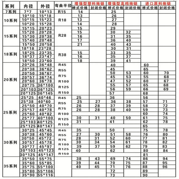系列 內存 外徑 彎曲半徑 增強型塑料拖鏈價格 增強型高檔拖鏈價格 進口原料工程拖鏈價格表